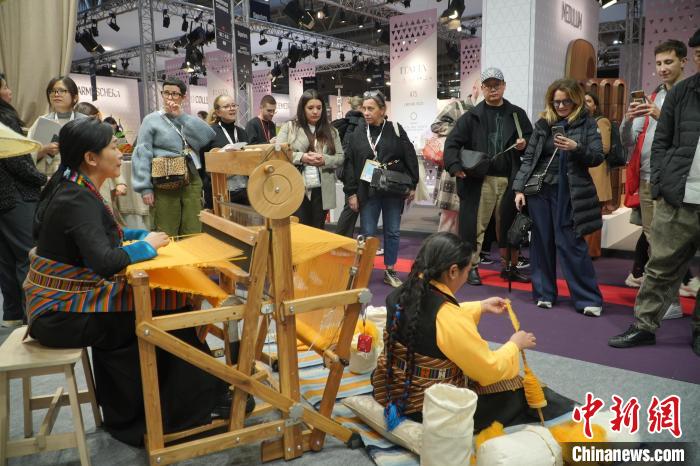 2024年1月,來自中國西藏的傳統(tǒng)氆氌亮相法國巴黎時(shí)尚家居設(shè)計(jì)展。(受訪者供圖)