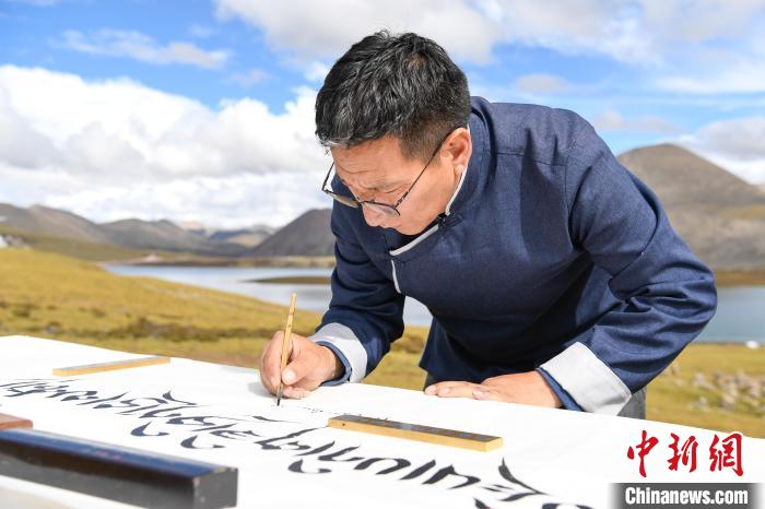 圖為書(shū)法家在思金拉措湖邊用藏文書(shū)寫“思金拉措”。貢嘎來(lái)松 攝