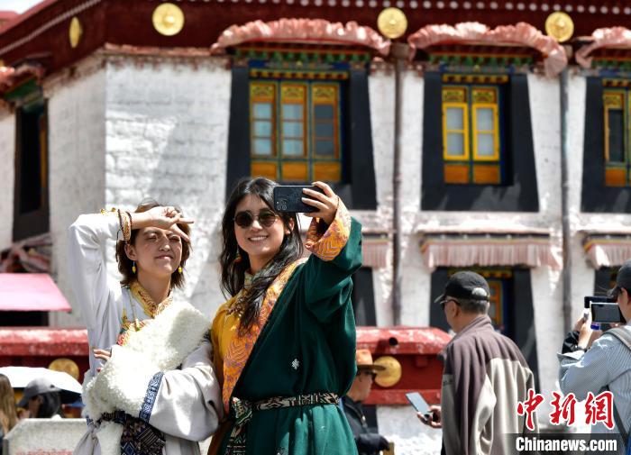 圖為9月7日游客在八廓街拍攝藏服寫(xiě)真。中新社記者 李林 攝