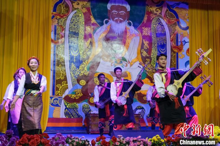 9月7日晚,西藏山南扎西曲登社區(qū)居民索朗堅(jiān)才(右前)在舞臺(tái)上表演彈奏六弦琴。中新社記者 江飛波 攝