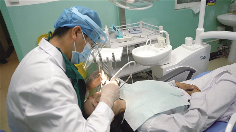 天津市第十批援藏干部、昌都市藏醫(yī)院口腔科副主任醫(yī)師杜斌正在對患者開展口腔治療。