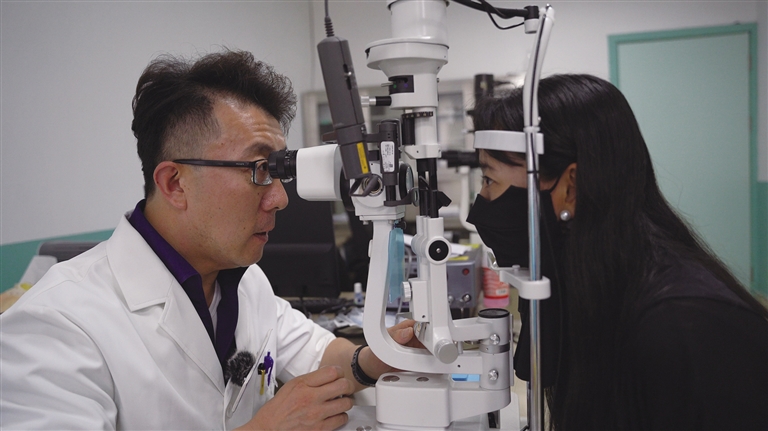 天津市第十批援藏干部、昌都市藏醫(yī)院眼科副主任醫(yī)師步紹翀開展眼科檢查。