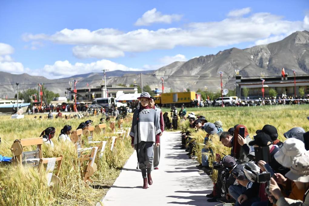 田野間,新開辟出的一條上百米的S形秀道婉轉(zhuǎn)綿延。隨著富有節(jié)奏感的音樂響起,身著氆氌藏族服飾的模特款款走來,一旁,30位藏族“阿佳”坐在編織機前熟練地捻織著氆氌手工品。