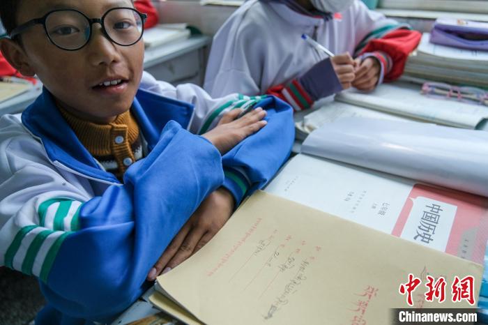 9月9日,西藏浪卡子縣中學(xué)初一年級(jí)學(xué)生展示他的中國(guó)歷史及藏語(yǔ)文教材。中新社記者 江飛波 攝