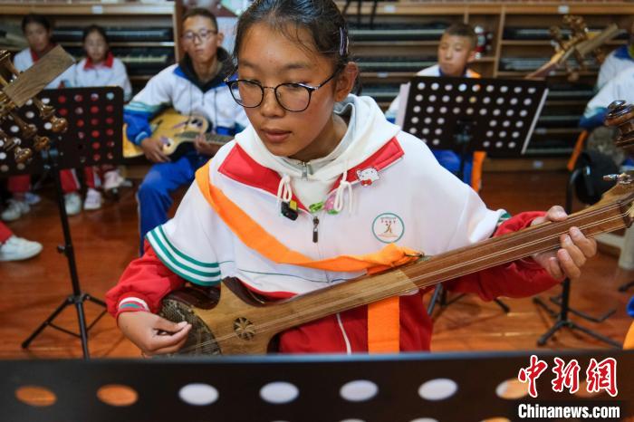 9月9日,西藏浪卡子縣中學(xué)初二年級(jí)白瑪卓嘎彈唱六弦琴。中新社記者 江飛波 攝