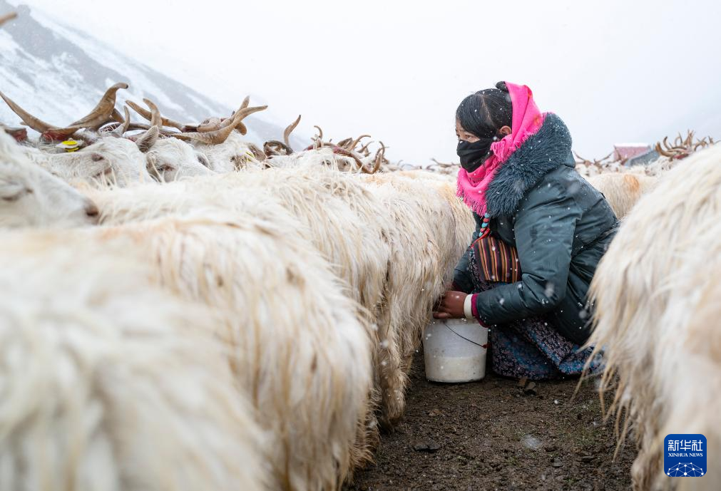 9月13日,在日土縣龍門(mén)卡村白絨山羊擴(kuò)繁場(chǎng),飼養(yǎng)員給白絨山羊擠奶。新華社記者 孫瑞博 攝