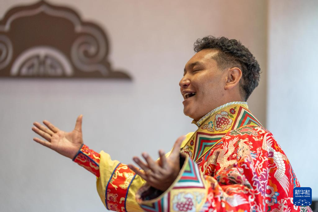 9月13日,格薩爾說唱藝人斯塔多吉在發(fā)布儀式現(xiàn)場(chǎng)表演格薩爾說唱。新華社記者 旦增尼瑪曲珠 攝