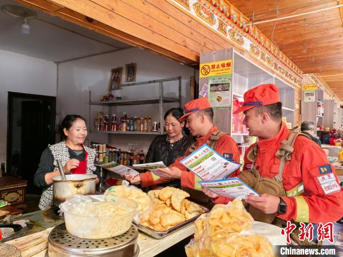 圖為消防員前往景區(qū)商鋪開展防火宣傳。袁勇斌 攝