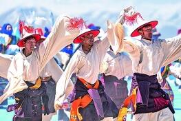 舞蹈演員在納木錯(cuò)開湖活動(dòng)現(xiàn)場(chǎng)表演。新華社發(fā)