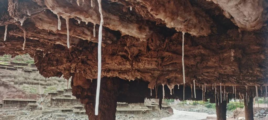 田下的鹽棚,儼然溶洞。低矮幽暗的鹽棚用西藏柏木架成,梁上掛滿鹽花,垂下的鹽柱宛如冰錐,鹽柱下方有滴鹵結(jié)晶形成的鹽筍。