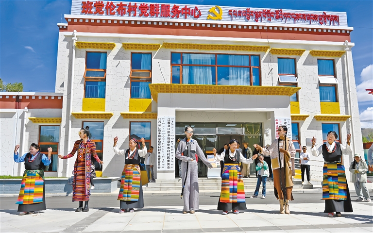 圖為9月,在日喀則市江孜縣江熱鄉(xiāng)班覺倫布村舉辦的西藏氆氌系列發(fā)布秀結束后,群眾齊跳鍋莊,跳出民族團結“同心圓”。