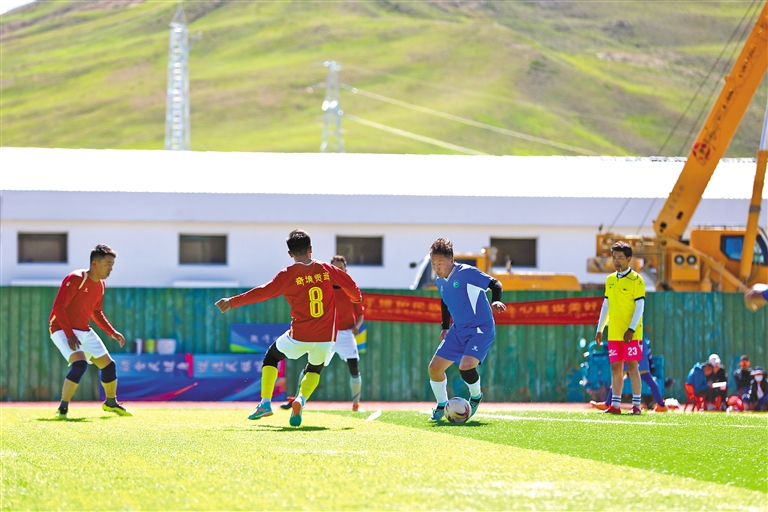 圖為吉隆縣“同心杯”干部職工足球比賽暨民族團結進步宣傳活動月啟動儀式結束后,參賽隊伍在進行比賽。