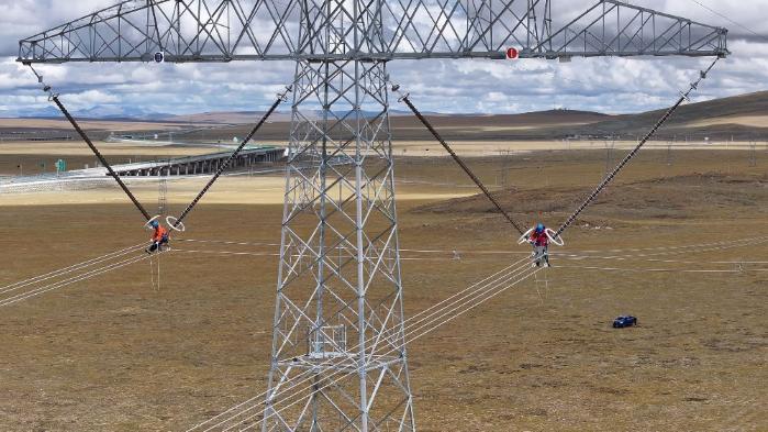 于是在接下來(lái)的幾天,記者跟隨著青藏聯(lián)網(wǎng)工程線路年檢工作人員沿著檢修輸電線路從拉薩市林周縣出發(fā)到那曲市安多縣境內(nèi),在此期間,記者經(jīng)歷了一年四季的天氣變化。9月20日,在青藏聯(lián)網(wǎng)工程西藏側(cè)林周段年檢現(xiàn)場(chǎng)2329號(hào)塔位,2名檢修人員正在40多米的高空檢查絕緣子、金具、導(dǎo)地線、引流板和間隔棒。與此同時(shí),“電力天路”上還有15名國(guó)網(wǎng)西藏電力輸電線路檢修人員同步穿梭在鐵塔與銀線之間,開(kāi)展年度檢修作業(yè)。