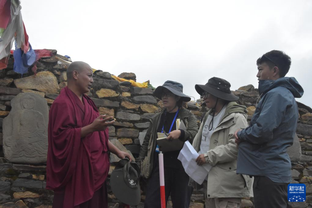 普查隊員正在向了解當(dāng)?shù)貧v史文化的僧人咨詢塔巴遺址歷史沿革。新華社記者 春拉 攝