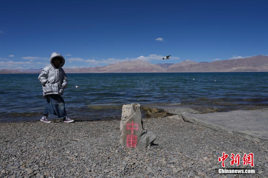 10月4日,一名小游客經(jīng)過班公湖畔的“中國”石碑?!笆弧眹鴳c假期,西藏日土縣班公湖吸引不少游客觀光游覽。中新社記者 崔楠 攝