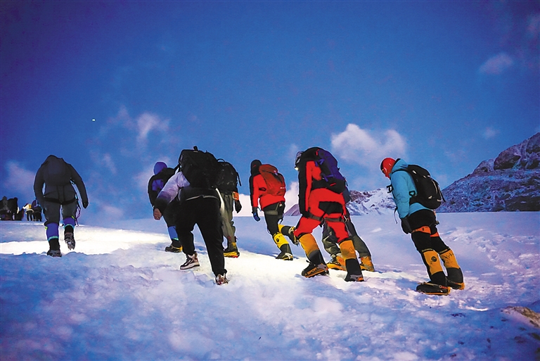 此前,為了讓山友熟悉相關(guān)設(shè)備的使用,自治區(qū)登山隊的向?qū)円呀?jīng)多次組織、演練設(shè)備使用。功夫不負有心人,此時此刻,經(jīng)過認真學習的山友們正熟練地運用著這幾天學到的技能向著山頂前進。隨著海拔的持續(xù)上升,大家只聽到來風聲在耳邊呼嘯,頭頂是炫目迷人的陽光。路程過半,山友們的身體和意志正在經(jīng)歷最嚴峻的考驗,沉重的大口呼吸聲此起彼伏。