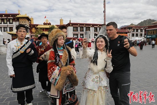 9月2日,西藏拉薩市八廓街,來自俄羅斯的巴德里(右一)與身穿藏族傳統(tǒng)服裝的年輕游客合影留念。近年來,來拉薩旅游,到八廓街、布達(dá)拉宮廣場(chǎng)拍一套藏服寫真,已經(jīng)成為進(jìn)藏旅游年輕人的“標(biāo)配”。中青報(bào)·中青網(wǎng)記者 孔斯琪/攝