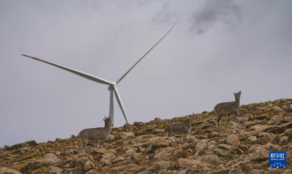 10月17日拍攝的位于西藏日喀則市薩迦縣的風力發(fā)電機組及周圍山上的野生動物。新華社記者 晉美多吉 攝??