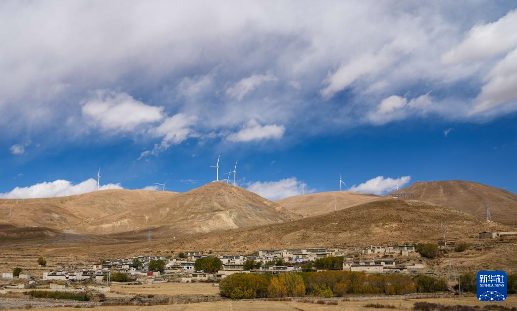 10月17日拍攝的位于西藏日喀則市薩迦縣的風力發(fā)電機組及山腳下的村莊。新華社記者 晉美多吉 攝?