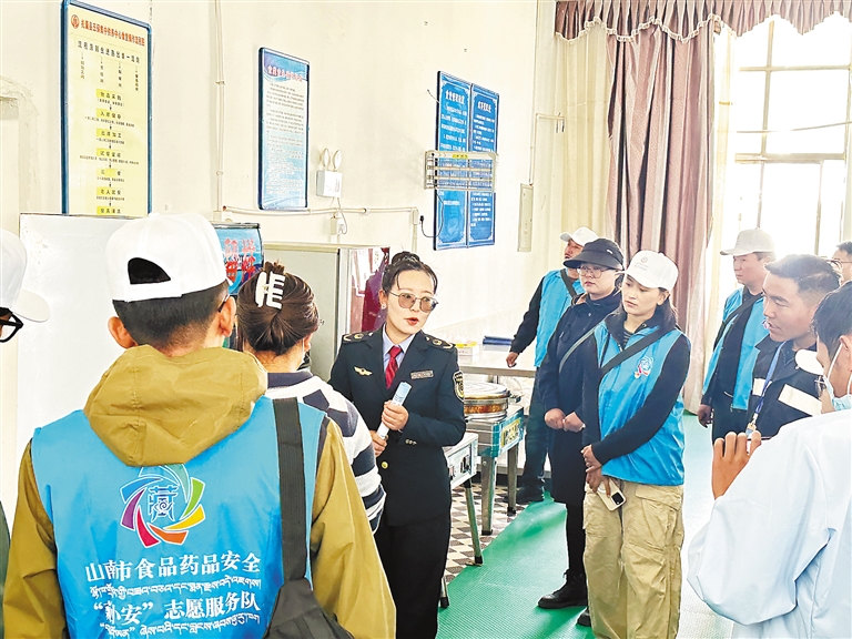 山南市市場監(jiān)管執(zhí)法人員向食品藥品安全志愿服務(wù)隊(duì)講解食品安全檢查相關(guān)內(nèi)容。記者 巴桑旺姆 攝