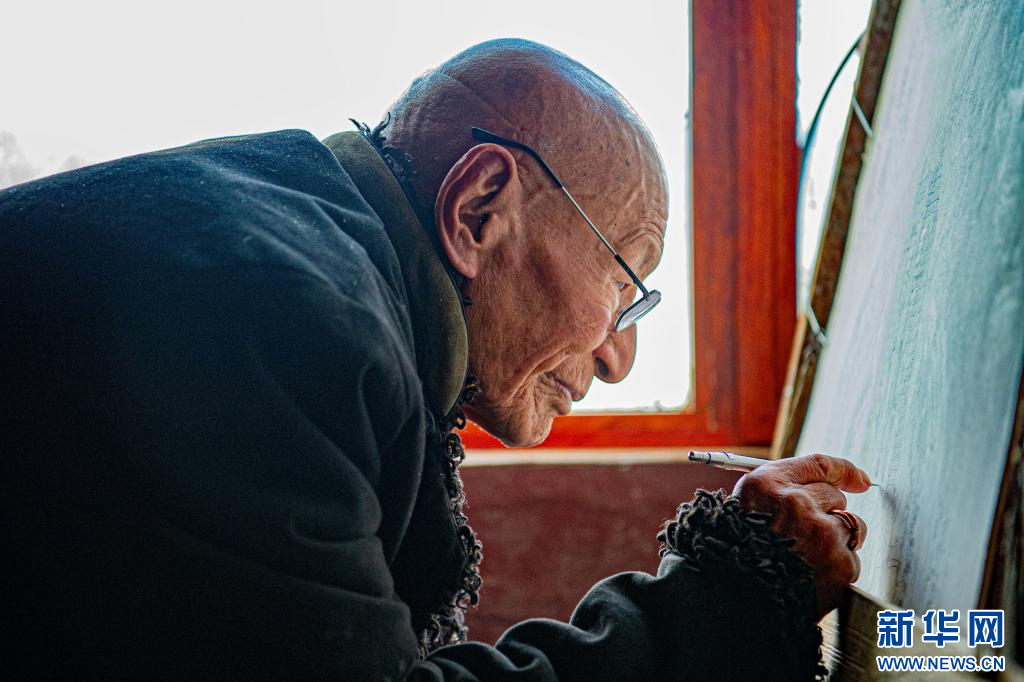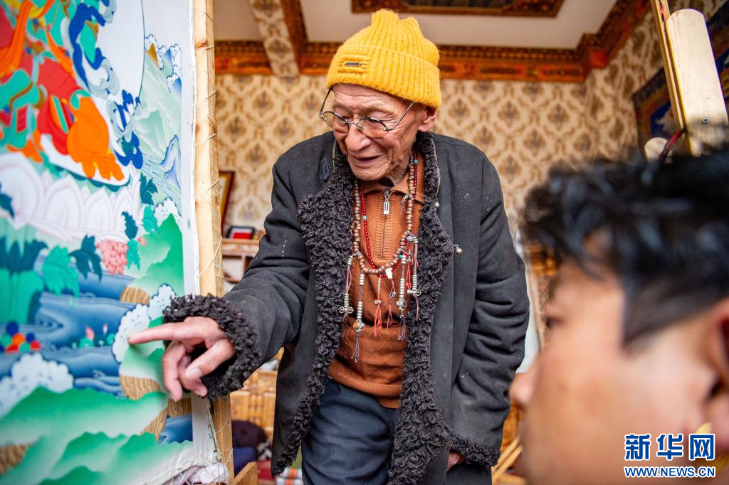 10月17日,今年92歲的昌都嘎瑪嘎赤畫派國家級非遺傳承人嘎瑪?shù)吕赵诩耶嬏瓶āP氯A網(wǎng) 旦增努布 攝