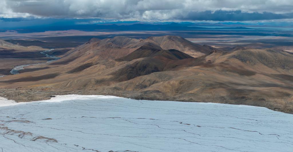 這是9月4日拍攝的普若崗日冰原8號冰川、消融形成的徑流以及遠(yuǎn)處的令戈錯(無人機(jī)拼接照片)。新華社記者 姜帆 攝