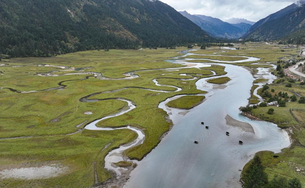 10月4日,在林芝工布江達(dá)縣,一隊牦牛涉水通過河流(無人機(jī)照片)。新華社記者 晉美多吉 攝