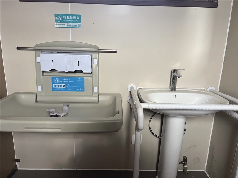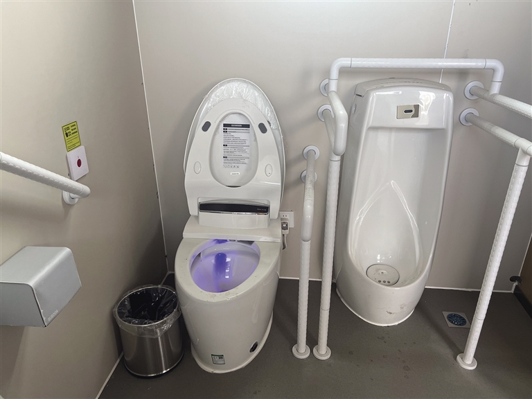 公廁內(nèi)部除了正常的蹲位,還設(shè)有第三衛(wèi)生間。第三衛(wèi)生間內(nèi)配有嬰兒護(hù)理臺、嬰兒安全座椅等設(shè)施。除此之外,第三衛(wèi)生間還設(shè)有安全扶手、智能馬桶等設(shè)備,方便腿腳不方便的老年人及殘疾人。智能馬桶旁還安裝有緊急報(bào)警器?!叭绻欣先嗽趲?,就可以按一下緊急報(bào)警器。這也是我們考慮到殘疾人、老年人如廁不方便,增設(shè)的人性化設(shè)計(jì)?!背嗔姓f。