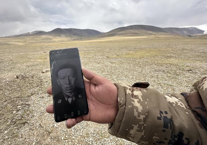 2024年6月15日,在西藏那曲市尼瑪縣境內(nèi)的羌塘國家級自然保護區(qū)“無人區(qū)”深處,格桑倫珠向記者展示他手機中珍藏的羅布玉杰的照片。新華社記者費茂華攝
