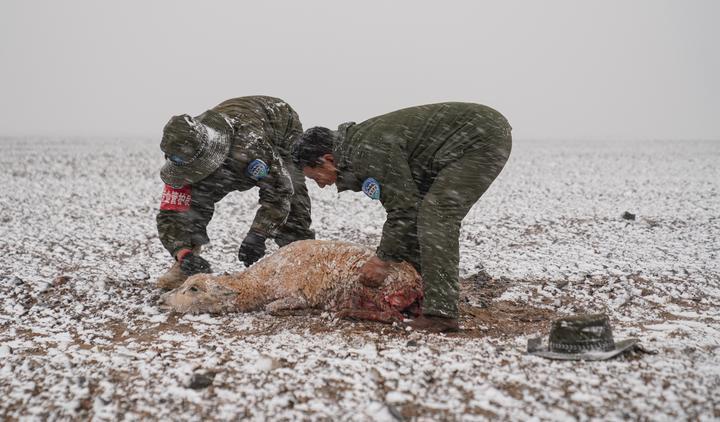 由于母羊倒下的位置距離營地太近,野狼不敢上前享用自己的獵物,只能悻悻而去。野管隊員們看到風雪中掙扎的母羊,心中不忍,將母羊抬到帳篷中進行救助。但由于傷勢太重,母羊肚皮被咬開且內(nèi)臟嚴重受損,野保隊員只能將它的肚皮縫上之后,按照慣例放歸到羌塘大草原。