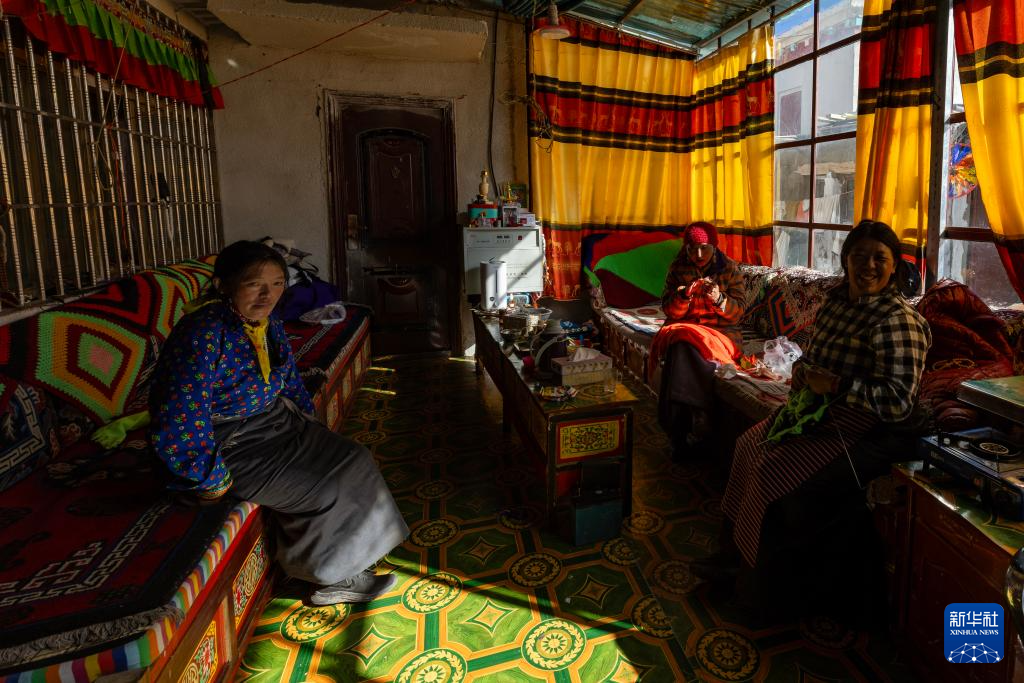 措勤縣扎日南木錯社區(qū)居民曲珍(右)在溫暖的家中與姐妹一起做手工(11月20日攝)。新華社記者 姜帆 攝