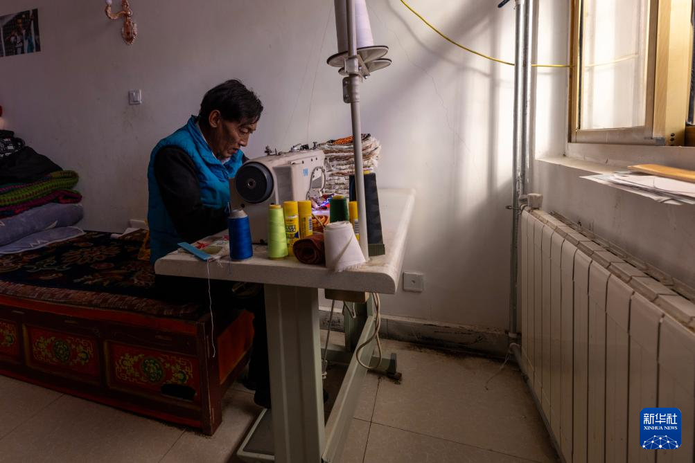 措勤縣扎日南木錯社區(qū)居民林瓊在自家的暖氣房內(nèi)制作傳統(tǒng)民族帽飾(11月20日攝)。新華社記者 姜帆 攝