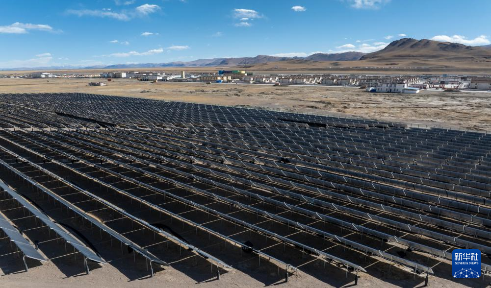 鳥瞰措勤縣城區(qū)清潔能源集中供暖特許經(jīng)營項目的光伏陣列(無人機照片,11月20日攝)。新華社記者 姜帆 攝