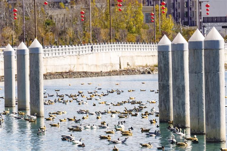 開(kāi)闊的河面上,斑頭雁、黃鴨、赤麻鴨等鳥(niǎo)類往來(lái)于此,此起彼伏的叫聲不絕于耳。在陽(yáng)光的照射下水面波光粼粼,候鳥(niǎo)或嬉游、或覓食、或追逐,這一和諧優(yōu)美的景象,引得不少觀賞的市民和游客舉起手機(jī)或相機(jī)記錄。