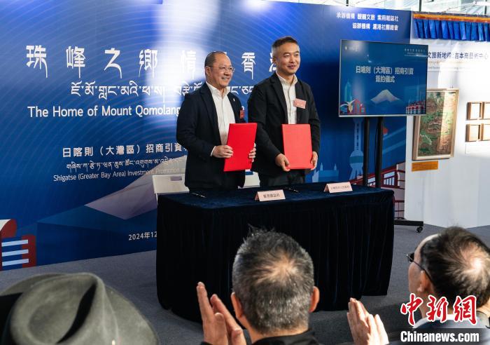 圖為日喀則市委副書記、常務副市長彭一浩(右)和紫荊雜志社總編輯袁建簽署招商引資協(xié)議。中新網記者 侯宇 攝