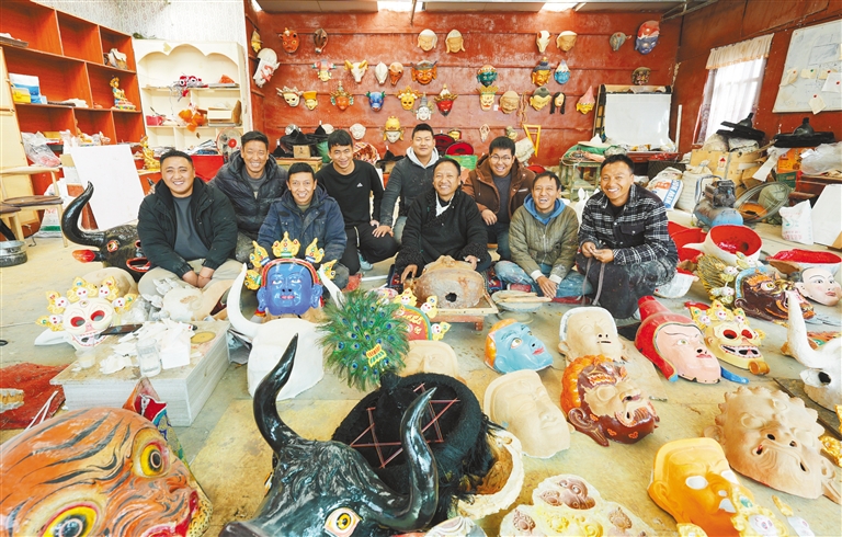 在拉薩市達孜區(qū)雪鄉(xiāng)民間傳統(tǒng)手工藝農(nóng)民專業(yè)合作社的小院里,拉薩布制面具制作技藝西藏自治區(qū)級非遺傳承人西洛和徒弟們忙得熱火朝天,他們正在制作面具。面具制作工序繁雜,制作一個面具包括雕刻、分層、風干和噴漆等十幾道工序。2012年,在政府的扶持下,西洛創(chuàng)辦了傳統(tǒng)手工藝合作社,主要制作和銷售藏戲面具。西洛制作的面具造型精美,廣泛運用于藏戲表演中?!懊婢叩膬r格從幾百元到幾萬元不等,大部分訂單來自西藏的各大藏戲團。”西洛說。近年來,合作社不斷吸納當?shù)厝罕妼W習面具制作技藝,不僅為當?shù)厝罕娞峁┚蜆I(yè)機會,也進一步助力非物質(zhì)文化遺產(chǎn)的保護和發(fā)展。