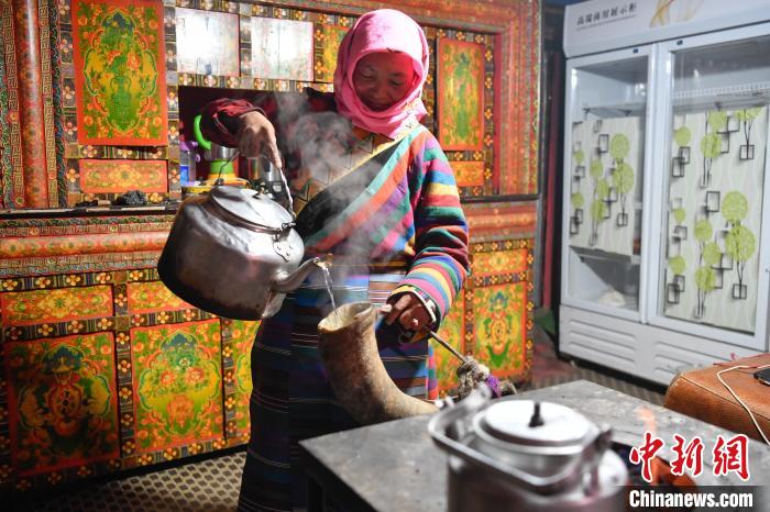 12月12日,西藏自治區(qū)那曲市安多縣帕那鎮(zhèn)牧民土巴卓瑪將擠好的牦牛奶倒入奶桶。中新社記者 貢嘎來松 攝