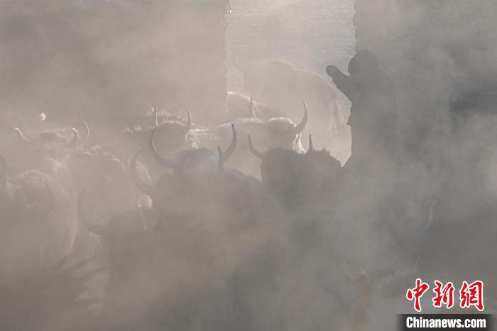 12月12日,西藏自治區(qū)那曲市安多縣帕那鎮(zhèn)牧民南色將自己的牦牛從牛圈放出。中新社記者 貢嘎來松 攝