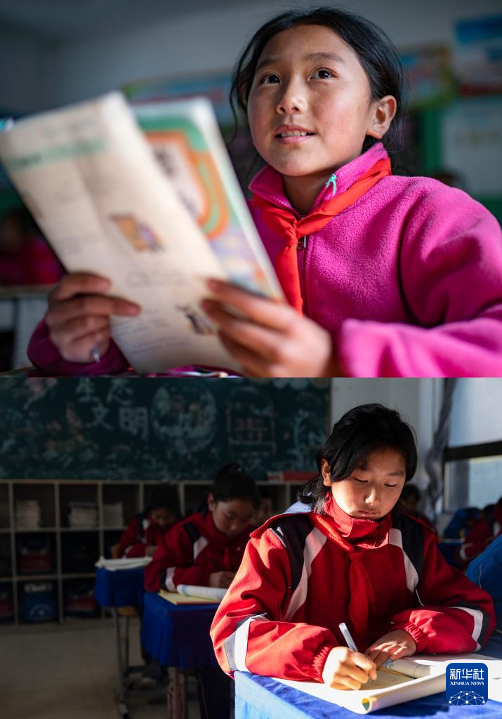 拼版照片:上圖為2021年11月24日,陳塘鎮(zhèn)小學(xué)三年級(1)班夏爾巴學(xué)生旺姆在讀課文;下圖為2024年12月13日,陳塘鎮(zhèn)小學(xué)六年級(1)班夏爾巴學(xué)生旺姆在上數(shù)學(xué)課。