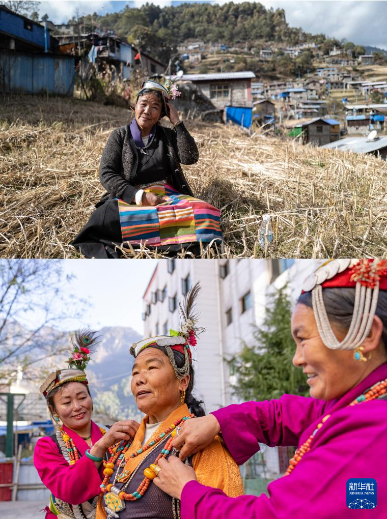 拼版照片:上圖為2021年11月27日,非遺陳塘夏爾巴歌舞代表性傳承人朗嘎在山坡上演唱時調(diào)整自己的頭飾;下圖為2024年12月13日,兩位夏爾巴婦女在為非遺陳塘夏爾巴歌舞代表性傳承人穿戴民族服飾。
