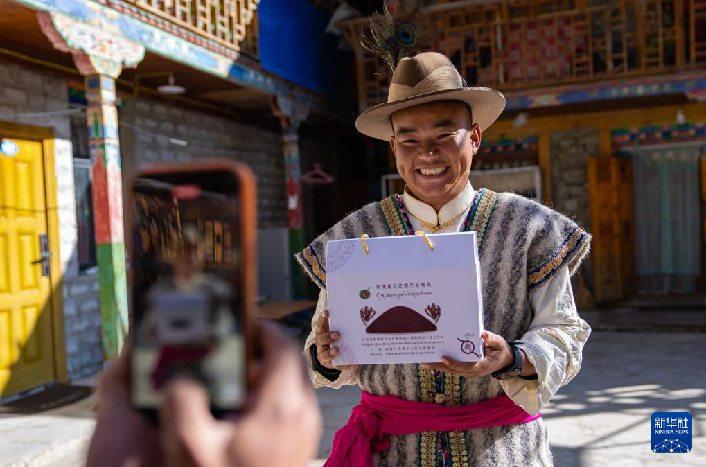 12月13日,自媒體博主夏爾巴人旦增在拍攝視頻推介當?shù)靥禺a(chǎn)雞爪谷糌粑。