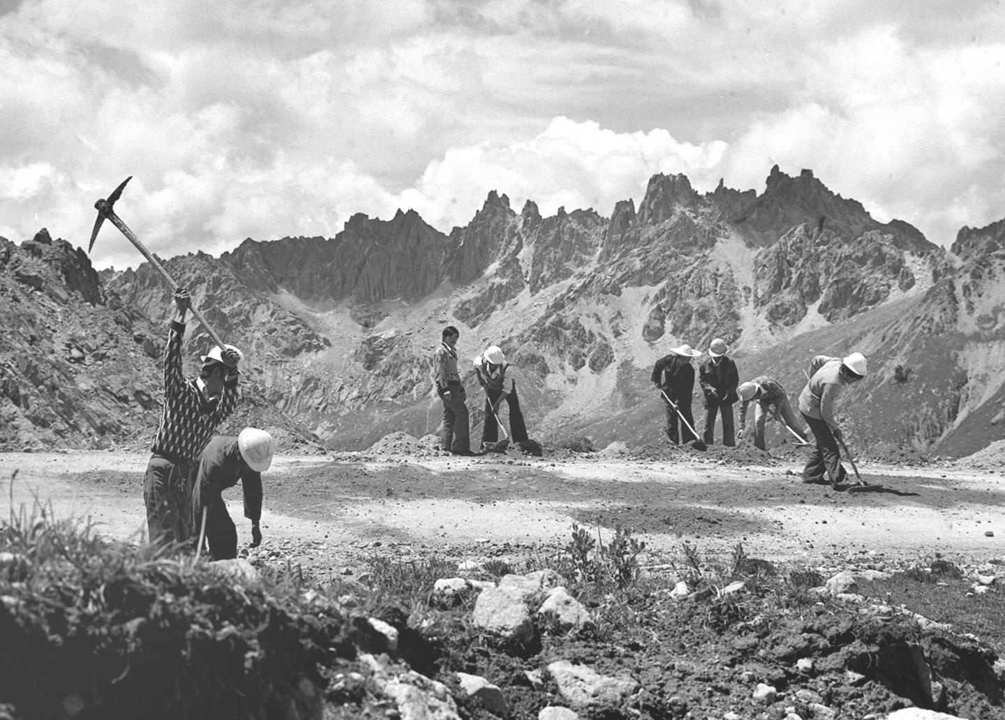 二十世紀(jì)60年代,在川藏公路上,辛勤的藏族養(yǎng)路工人熱情地向過路的旅客們揮手。