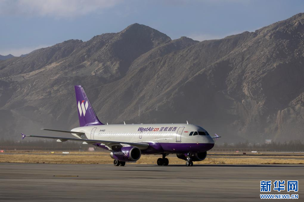 25日,執(zhí)飛拉薩-重慶-新加坡國際新航線首飛任務(wù)的西部航空PN6425客運(yùn)航班降落在拉薩貢嘎國際機(jī)場(chǎng)。新華社記者 姜帆 攝