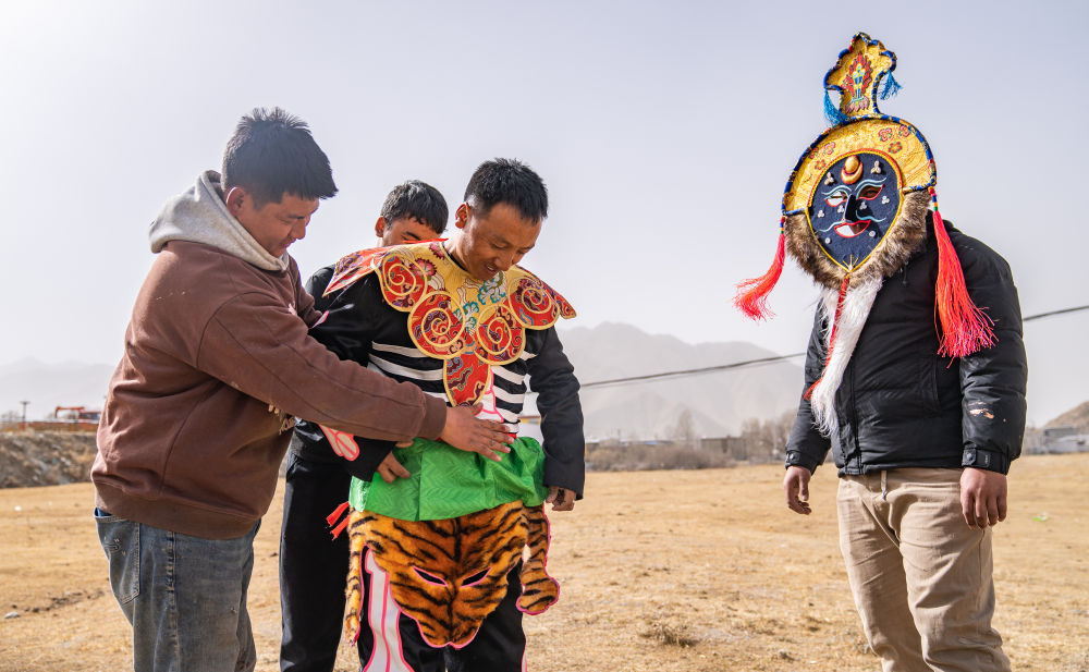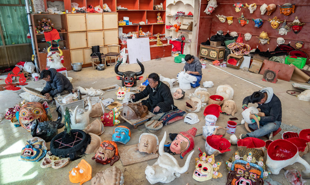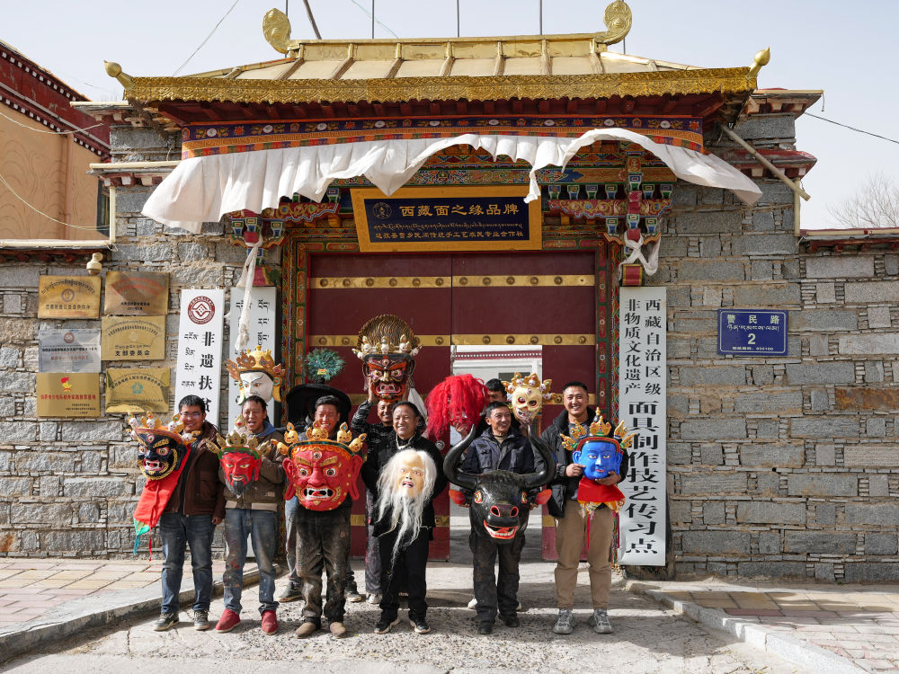 拉薩達(dá)孜區(qū)雪鄉(xiāng)民間傳統(tǒng)手工藝農(nóng)民專業(yè)合作社的工匠在合作社門(mén)前的空地上佩戴檢查做好的西藏傳統(tǒng)面具。