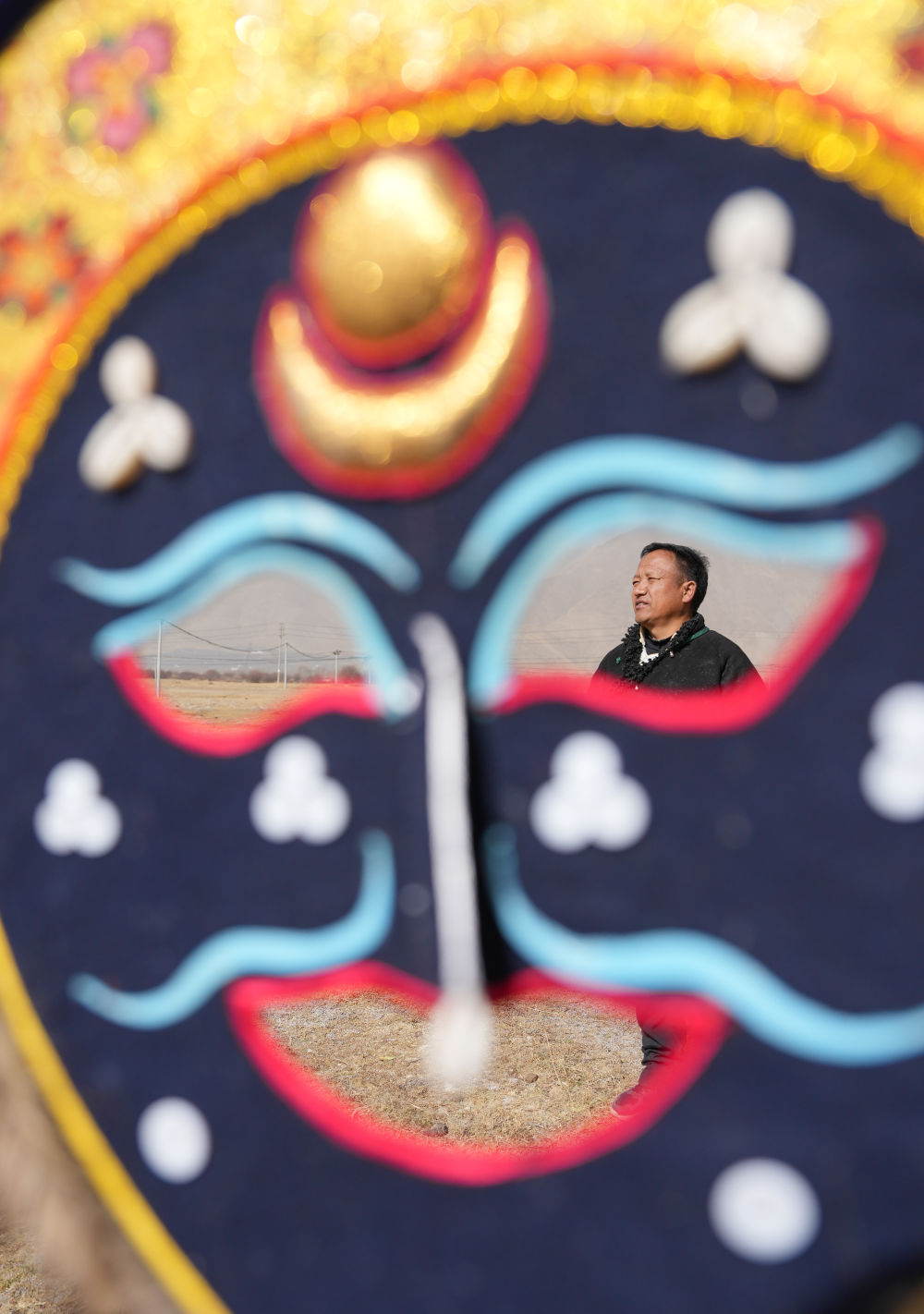 拉薩布制面具制作技藝西藏自治區(qū)級(jí)非遺傳承人西洛在合作社門(mén)前的空地上和同事一起檢查做好的西藏傳統(tǒng)面具。