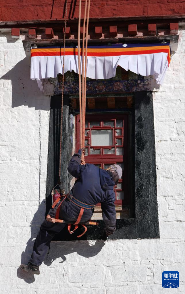布達(dá)拉宮管理處維修科工作人員在整理安全繩,準(zhǔn)備粉刷墻體(12月4日攝)。新華社記者 晉美多吉 攝