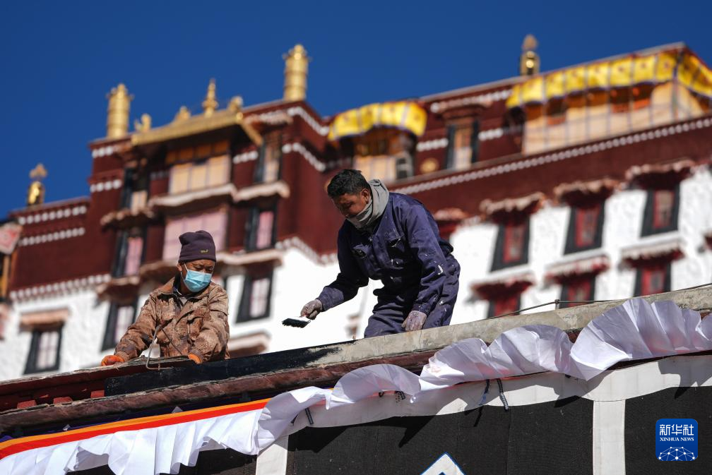 布達(dá)拉宮管理處維修科工作人員在噴灑涂料(10月30日攝)。新華社記者 晉美多吉 攝