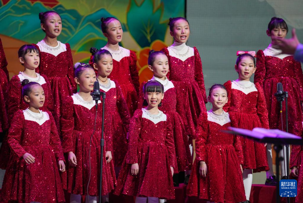 12月28日晚,西藏珠峰少年合唱團學員代表合唱歌曲《快快走唱首歌》。
