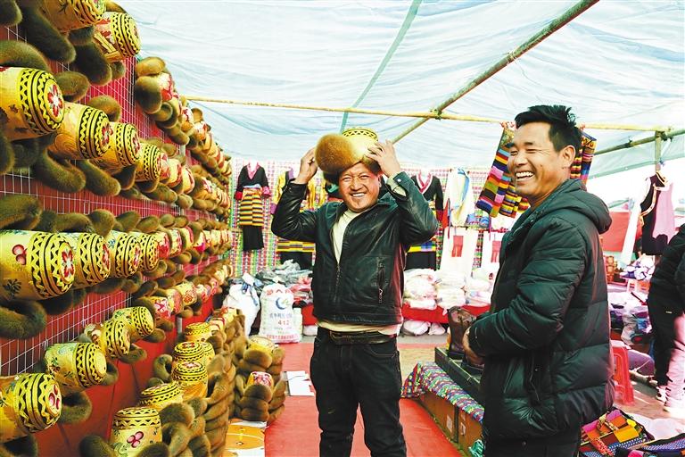 為何如此熱鬧?原來這里是體驗周的“重頭戲”——冬季物資交流會。現(xiàn)場,從服裝服飾到農(nóng)特產(chǎn)品,從肉類食品到民族手工藝品,應(yīng)有盡有,可滿足不同消費者的需求。