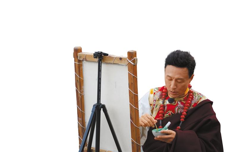 中央廣播電視總臺“乘著大巴看中國·西藏行”的嘉賓在嘎瑪鄉(xiāng)體驗唐卡繪畫。記者 貢秋曲措 攝
